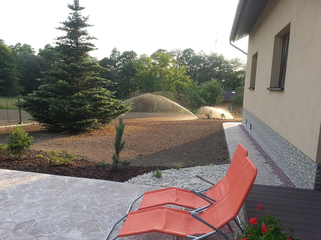 Řešením je instalace automatického zavlažovacího systému. Moderní systém se skládá z pod zemí ukrytého potrubí a výsuvných postřikovačů, které jsou ukryty pod úrovní terénu. Po otevření přívodu vody elektromagnetickými ventily se postřikovače vysunou nad terén a po skončení zavlažování se opět zasunou do podzemních pouzder. Nic nebrání užívání zahrady ani sekání trávy. Naprogramovaná centrální ovládací jednotka se o celý režim postará za Vás a pro případ deště je v pohotovosti automatické čidlo srážek, které celý systém dočasně vypne. Zavlažovací systém poskytuje svému majitele celou řadu výhod. Připomeňme si pouze ty nejzákladnější. Automatizace odstraní nepříjemnou a zdlouhavou práci s konví a hadicí, ušetřený čas pak můžete věnovat Vašim koníčků nebo rodině. Moderní systémy pracují v nočních hodinách, kdy je hodnota výparu nejnižší a proto spotřebují až o 30% méně vody. V neposlední řadě se systém postará o Vaši zahradu i v době Vaší nepřítomnosti během dovolené. Díky čidlu srážek systém reaguje na změny počasí a nezavlažuje nadbytečně. Navíc, krásné okolí domu bez jakýchkoliv diskusí zvyšuje tržní hodnotu a prestiž nemovitosti.